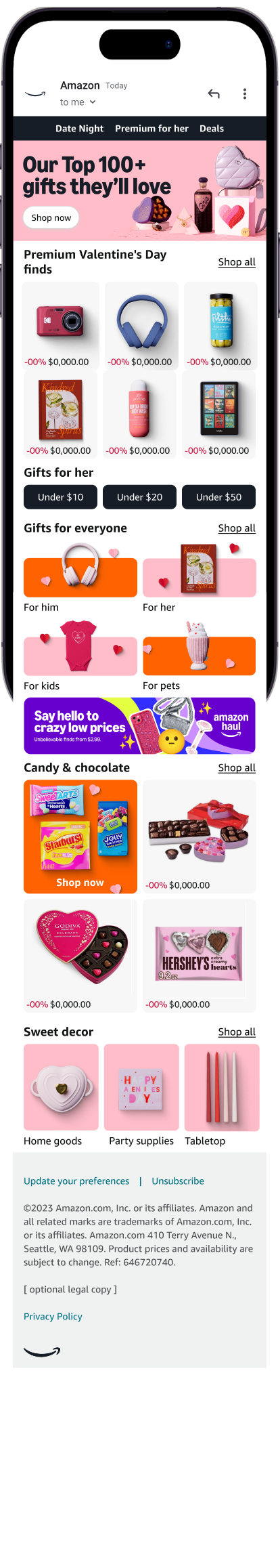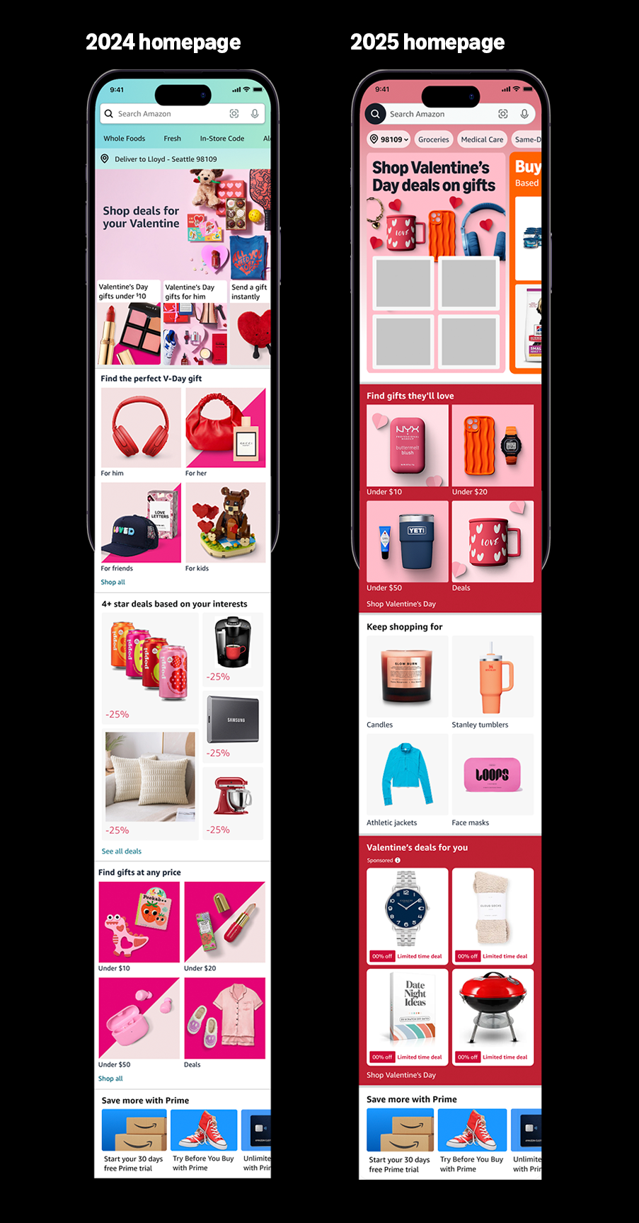 For mobile and desktop heroes, we highilghted Amazon’s new homepage design as well as typeface. The new design of our homepage heroes invited interactivity and thoughtfully used color to break-up the feed and highlight personalized product recommendations.